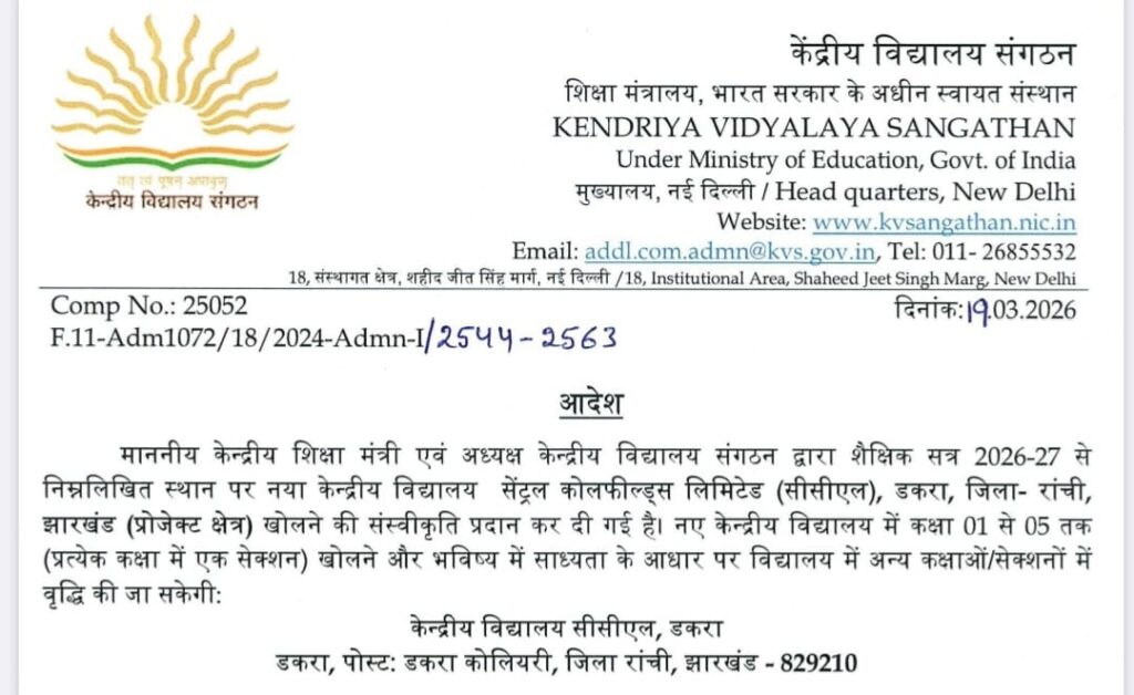 रांची/खलारी/डकरा । डकरा में वर्षों से बंद पड़ा केंद्रीय विद्यालय इस शैक्षणिक सत्र से चालू हो जाएगा। इसके लिए केंद्रीय शिक्षा मंत्री धर्मेंद्र प्रधान और केंद्रीय विद्यालय संगठन ने स्वीकृति प्रदान कर दी है। बंद पड़े इस विद्यालय को पुन: चालू करने में रक्षा राज्य मंत्री सह स्थानीय सांसद संजय सेठ का सबसे महत्वपूर्ण योगदान रहा है। निकाली गई अधिसूचना के अनुसार इस वर्ष शैक्षणिक सत्र 2026-27 से यहां नामांकन शुरू होगा। इसके साथ ही कक्षा 1 से 5 तक की पढ़ाई शुरू होगी। वर्तमान समय में प्रत्येक कक्षाओं का एक-एक सेक्शन रहेगा। फिर भविष्य की जरूरत के अनुसार उसे आगे बढ़ाया जा सकेगा। अन्य प्रक्रियाएं भी शीघ्र पूरी हो जाएंगी। इधर धरातल पर भवन के रंग रोगन का कार्य भी लगभग अंतिम चरण में है। इस बाबत रक्षा राज्य मंत्री संजय सेठ ने कहा कि वर्ष 2019 में सांसद बनने के उपरांत इस क्षेत्र के लोगों की पहली मांग यही थी कि यहां वर्षों से बंद पड़े केंद्रीय विद्यालय को चालू किया जाए। मैंने लगातार यह प्रयास किया और उसका सकारात्मक प्रतिफल अब सामने आया है। खलारी और डकार क्षेत्र की जनता ने मुझे जो स्नेह और आशीर्वाद दिया, मुझ पर जो विश्वास जताया; उसे पूर्ण करने के लिए हमेशा से ही प्रयासरत रहा हूं। आगे भी यह प्रयास जारी रहेगा। क्षेत्र की जनता को दिए गए इस उपहार के लिए संजय सेठ ने प्रधानमंत्री नरेंद्र मोदी और केंद्रीय शिक्षा मंत्री धर्मेंद्र प्रधान के प्रति आभार प्रकट किया है। Post navigation राहुल गांधी के नक्शे कदम पर झारखंड के मुख्यमंत्री हेमंत सोरेन, हिंदू देवी देवता,पर्व त्योहारों का कर रहे अपमान-आदित्य साहू मुख्य निर्वाचन पदाधिकारी ईवीएम वेयरहाउस, हजारीबाग के त्रैमासिक निरीक्षण में शामिल हुए, निर्वाचन पदाधिकारी सह उपायुक्त रहे मौजूद